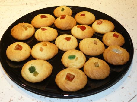 Déposer sur chaque sablé un petit morceau de fruit confit. Laisser croûter 1 heure avant de cuire à 180°C (Th6) pendant 7 à 8min (à four préchauffer).